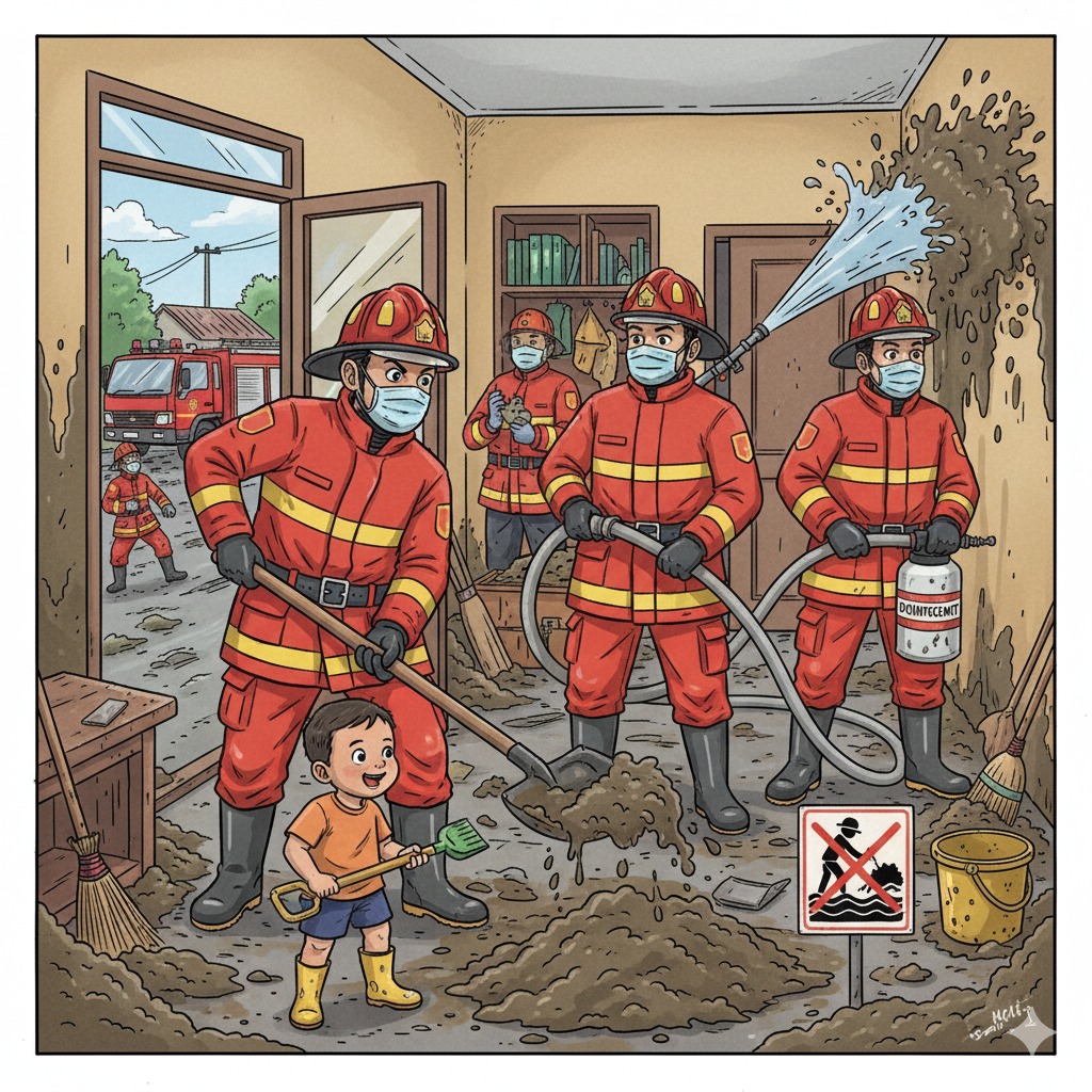 “Gunakan sarung tangan, masker, dan sepatu boot. Jangan lupa membersihkan permukaan lantai, meja, dan dinding dengan desinfektan setelah lumpur dibersihkan. Bukan hanya memadamkan api, Damkar juga hadir membantu pemulihan pasca bencana,” ujarnya, Minggu (14/9/2025).